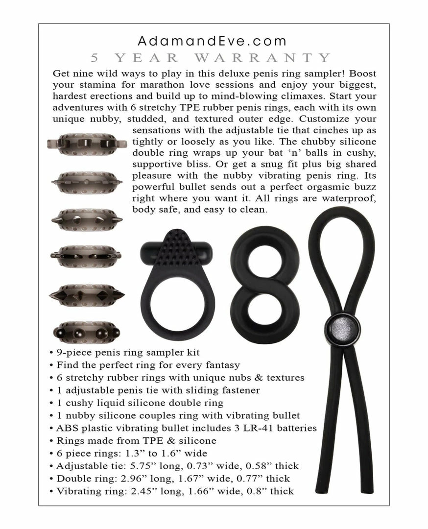 Get nine wild ways to play in this deluxe penis ring sampler! Boost your stamina for marathon love sessions and enjoy your biggest, hardest erections and build up to mind-blowing climaxes. Start your adventures with 6 stretchy TPE rubber penis rings, each with its own unique nubby, studded, and textured outer edge. Customize your sensations with the adjustable tie that cinches up as tightly or loosely as you like. The chubby silicone double ring wraps up your bat ‘n’ balls in cushy, supportive bliss. Or get a snug fit plus big shared pleasure with the nubby vibrating penis ring. Its powerful bullet sends out a perfect orgasmic buzz right where you want it. All rings are waterproof, body safe, and easy to clean.