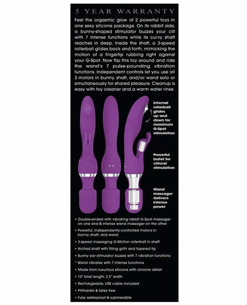 Play in so many new ways with this dual-ended 10″ silicone rabbit vibe! Up top, a 3-speed rollerball inside the shaft rolls back and forth, mimicking the massage of a finger for intense G-Spot stimulation. Then let the clitoral stimulator bunny buzz you with 7 powerful vibration functions. Or turn it around and feel its bed-shaking 7 function wand massager head. Which way do you want to play today? With the Adam & Eve G-Motion Rabbit Wand, it’s any way you choose. Each of this clever and stylish rabbit’s stimulators has independent controls – so you can feel a G-Spot massage, clitoral stimulation, or both from the shaft and the bunny. Or you can flip this vibe over and feel toe-curling power from the wand on the opposite side. In fact, you can use all three stimulators at once – or use one end yourself while a playmate enjoys the other! Rechargeable, includes USB charging cable. Approx. 50 minutes playtime, full recharge in 3.5 hours. Waterproof and fully submersible. From Adam and Eve. 5 Year Warranty.