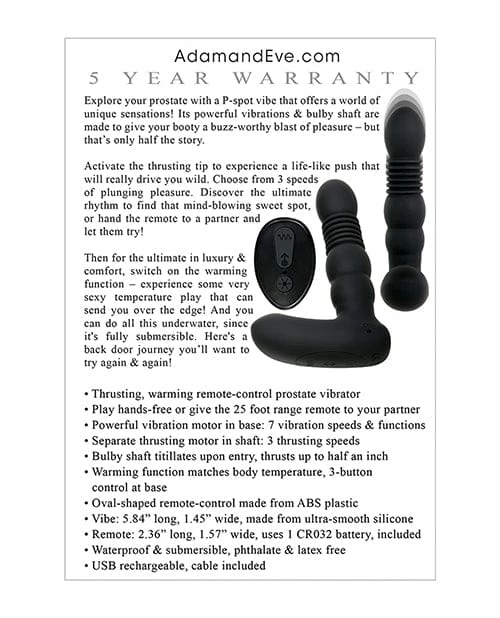 Explore you prostate with a P-spot vibe that offers a world of unique sensations! Its powerful vibrations and bulbous shaft are made to give your booty a buzz-worthy blast of pleasure – but that’s only half the story. Activate the thrusting tip to experience a life-like push that will really drive you wild. Then switch on the warming functions – experience some very sexy temperature play that can send you over the edge! Vibe: 5.84 inches long, 1.45 inches wide.