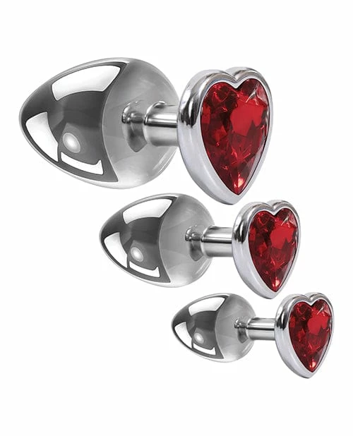 This set of gleaming metal anal plugs with sparkling jeweled red heart bases is sure to make you fall in love with anal fun. Each plug is crafted from smooth, weighty metal for an easy glide in and intense feel. Three unique sizes let you find just what’s right for you. Start small and work your way up to the largest size for the most incredible anal pleasure you’ve ever experienced! The jeweled flared base makes inserting it easy, and keeps the plug in place no matter how wild the action gets. The metal also holds temperature, so experiment with chilling or warming the plugs for even more excitement.