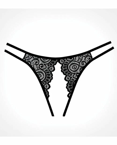 Immerse yourself in sexy sophistication in this flirty panty featuring a swirling sheer lace with an open peek-a-boo crotch panel, double thin hip straps, a lace back panel, and an open rear with booty shaping straps.