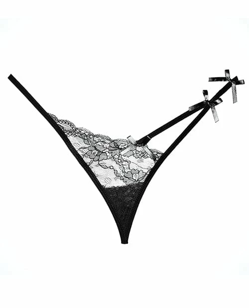 This flirty black panty features a sheer, asymmetrical lace front panel with a scalloped trim, strappy detailing, satin bow accents, a thin waistband, and a thong cut back. Color: Black One Size. Bust: 34in.-38in. Waist: 26in.-30in. Low Waist: 28.5in.-32.5in. Hip: 36in.-40in.