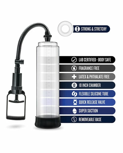 Make it thicker, longer and stronger with The Pump from Blush Novelties. For foreplay, penis enlargement, endurance training, or solo masturbation The Pump is a visual stimulator, an erection enhancer and a sexual male pleasure product all in one package. The Pump comes with an airtight chamber, advanced trigger pump, a soft X5 pump sleeve and extra pump sleeve. The airtight vacuum chamber is clear for viewing progress. Unlike standard squeeze bulb pumps, the trigger pump design gives you precise intensity control, generates a stronger vacuum and a quick release valve allows you to comfortably remove your penis. Made from X5 for a realistic feel, the vagina shaped pump sleeve embraces the head of the penis and warms your shaft after each pump. X5 is skin safe and easy to clean with toy cleaner or soap and water. Air-dry your X5 sleeve and apply cornstarch to maintain a silky smooth surface for next time. Extra chamber sleeves are for erection enhancement minus the visual sensation.