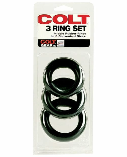 Receive a “helping hand” in the longevity department with this handy Colt 3 Ring Set! Maintain throbbing erections, prolong ejaculation, and enjoy the lasting pleasures you desire with the help of these incredible rings. The pliable rubber rings in three convenient sizes put a squeeze on performance letdowns and helps you last strong all night long. The inside diameters are 1.5″, 1.75″, 2″. The rings can be used by themselves or with condoms.