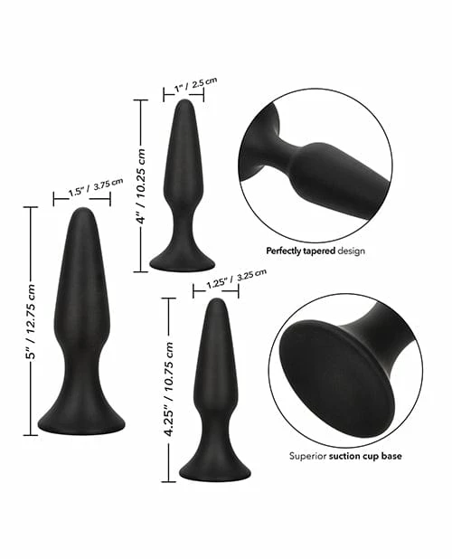 To enjoy everything the exhilarating world of anal play has to offer, training is in order to ensure total safety and satisfaction. Our tapered silicone plugs allow you to gently increase the size of your pleasure as you tease and train. While each increase of your training expands your horizons, use the convenient suction cup base for hands-free stimulation, effortless insertion and gentle removal.