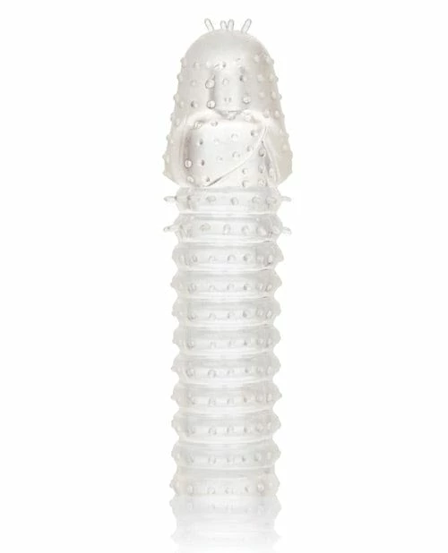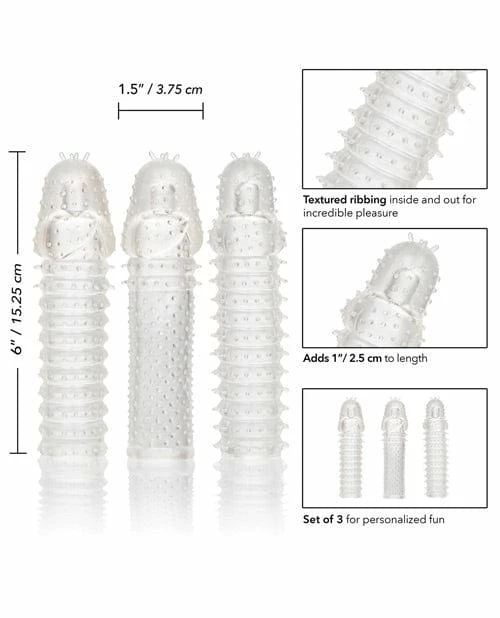 The 3 Piece Extension Kit is a set of 3 super tight, close-end extension sleeves with a ribbed texture inside and out for intense stimulation. These enlarging enhancer sleeves wrap tight to increase girth, length and explosive pleasure for everyone involved. The erotic enhancer sleeve’s ultra-stretchy material and spacious chamber is made to fit even the biggest man. While you thrill your lover with increased girth and stimulating ticklers, the fulfilling enhancer’s powerful erection support and textured chamber result in explosive results for both of you. The textured chamber and erection enhancer provide increase stimulation and powerful support. Wrap your pleasure tool in this super stretchy sleeve to easily increase stamina, stimulation and orgasmic pleasure. Color: Clear Material TPR Measurements : 6″ x 1.5″ / 15.25cm x 3.75cm (Sleeves)