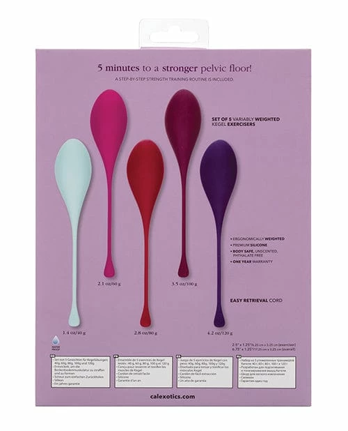 Tighten and tone pelvic floor muscles in only 5 minutes a day with the CalExotics Kegel Training 5-Piece Set. Give your pelvic floor muscles the training they have been craving with 5 gradually weighted exercisers to gently increase exercise intensity and sexual pleasure. The 5-piece set includes a 40 g, 60 g, 80 g, 100, and 120 g and a full workout routine. While the dual weights work to increase sexual arousal, they?re designed to gently tone and strengthen pelvic muscles. By working those key love muscles, you reduced the risk of pelvic floor disorders or incontinence, while increasing erotic pleasure. An extended retrieval cord makes removal quick, easy, and gentle. The kegel weights are made from a hygienically superior silicone. This body safe material is unscented and phthalate free to keep your most sensitive spots happy and healthy.