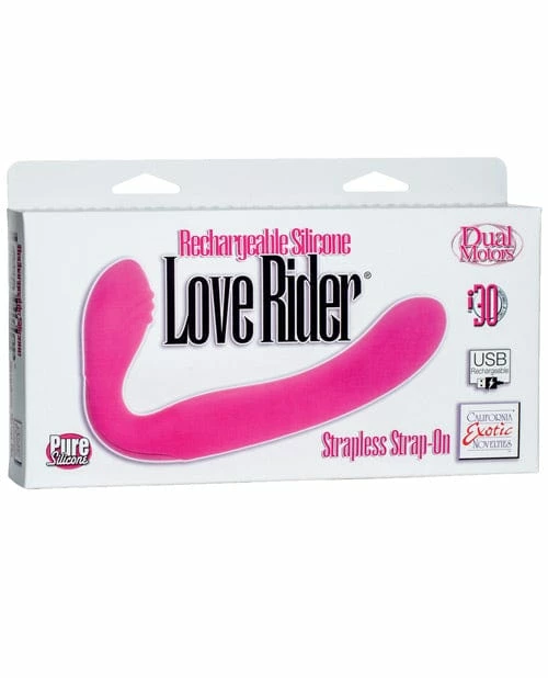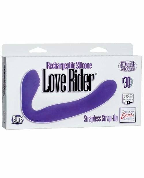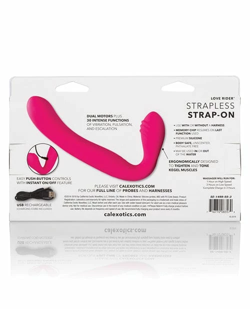 Love Rider Rechargeable Strapless Strap On from California Exotics. Made from premium, solid, sturdy, rechargeable Silicone probe. Includes dual motors with 30 functions of intense vibration, pulsation and escalation and a memory chip that resumes on last function used. The Love Rider is ergonomically designed to tighten and tone Kegel muscles and can be used with or without a harness. Features easy push-button controls with auto off button. USB rechargeable (includes charging cord). Complete charge in 3 hours. Probe will run for 1 hour on high speed, 3 hours on low speed. Silicone (probe) ABS with PU Cote (base). Small probe: 3.5″ X 1.5″ /9.5cm X 3.75cm. Large probe: 7.75″ X 1.5″ / 19.75cm X 3.75 cm.