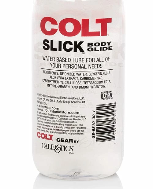 COLT Slickโข Lube is a sensually gratifying water based personal lubricant that will enhance your pleasure and make your fun more intense. Use the lube your favorite COLT stars use. COLT Slickโข Lube is latex compatible, and offers the ultimate in all your personal lubricant needs. Intensify your gratification in the utmost comfort with this super slippery and fantastically sensual lube. Indulge yourself and your partner. What are you waiting for? 16.57 ounce bottle