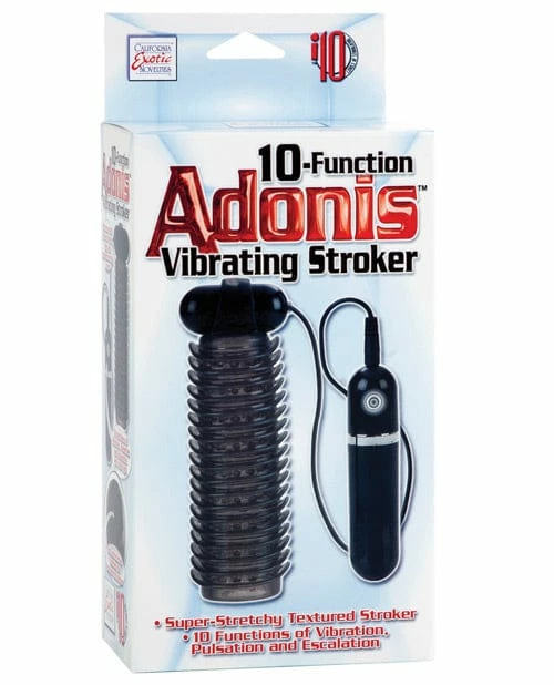 The Adonis 10 Function Vibrating Stroker from Cal Exotics, a soft, tight, and stretchy stroker with removable vibrating bullet. 10 functions of vibration, pulsation, and escalation. Push button controller with LED indicator and plug-in jack. Hold button for 3 seconds to turn off. Pleasure chamber with over 120 well placed ticklers. Ribbed exterior for a secure grip. TPR (stroker) ABS (controller, bullet) Phthalate-Free PVC (cord). 5.5″ x 2″/14 cm x 5 cm (stroker). 2″ x 1″/5 cm x 2.5 cm (bullet). Requires 2 AAA batteries, not included.
