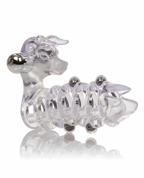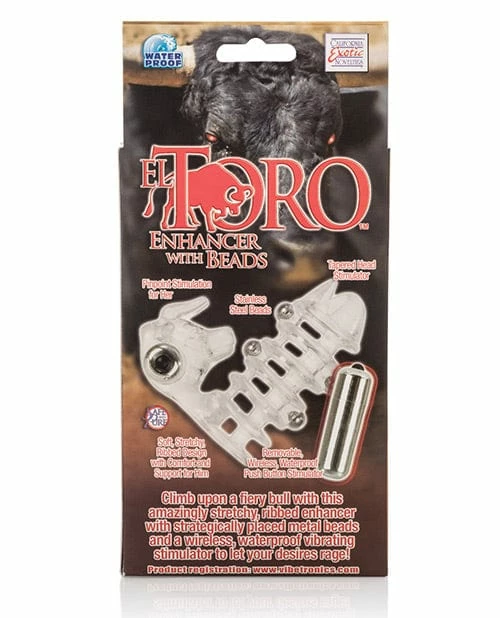 Indulge in red-hot passionate action with the El Toro Enhancer with Beads. The seductive sensually ribbed erection enhancer features a bull shaped clitoral teaser head and removable wireless bullet stimulator. You and your partner will enjoy the sensational power of the bull, which provides tantalizing orgasmic vibrations. The El Toro Enhancer with Beads is made from super soft and ultra stretchy phthalate free TPR, and features 2 silver plated stimulation beads for maximized sensitivity application. The translucent ribbed sleeve offers stamina support for mind-blowing and prolonged rock hard performances. The bull shaped teaser delivers precision clitoral stimulation to satisfy her every desire. The discreet El Toro Enhancer with Beads is ideal for enhancing intimacy and excitement. The easy to use push button bullet stimulator inserted into the sleeve for erotic vibrations, can also be used for independent stimulation of erogenous zones all over the body. Waterproof. Materials Thermoplastic Rubber, ABS Plastic / Metallic Plating Power Source 3 Watch Batteries (Included) Measurements 2.2″ x 0.6″ / 6cm x 2cm (Bullet) 2.75″ x 3.5″ x 1.25″ / 7cm x 9cm x 3cm (Enhancer)
