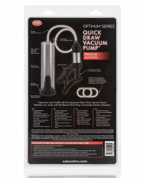 Get the maximum results with minimal effort! Experience quick results with the easy-to-use Quick Draw Vacuum Pump. Maintain your results with the Silicone penis pump commander erection enhancer that is included. The Quick Draw is made up of a flanged base cylinder with a removable snug latex sleeve and a push button quick release valve which connects to a hand pump with EZ-Grip handle via a flexible non-crimp hose. Pump up your bedroom performance!