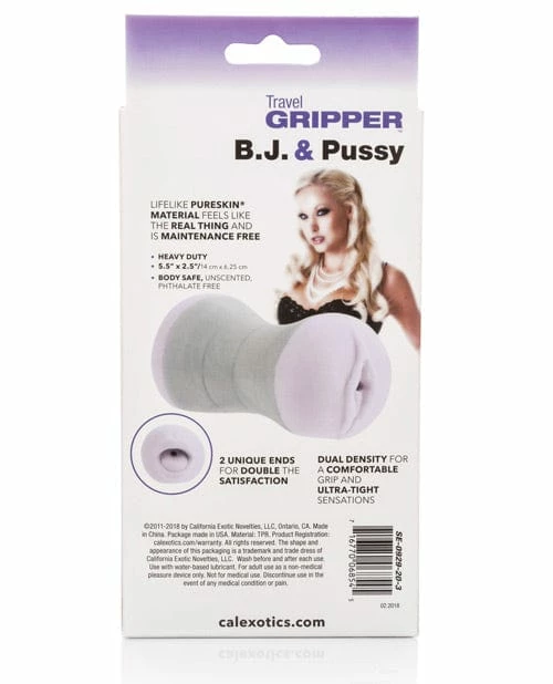The Travel Gripper B.J. and Pussy from Cal Exotics. Complete travel sized masturbator with 2 ends. Dual density for the ultimate stroking action. Life-like look and feel. Heavy duty one-piece masturbators with ribbed suction chambers. Unique design for maximum grip. Pure Skin/TPR. 5.5″ x 2.5″/14 cm x 6.25 cm.