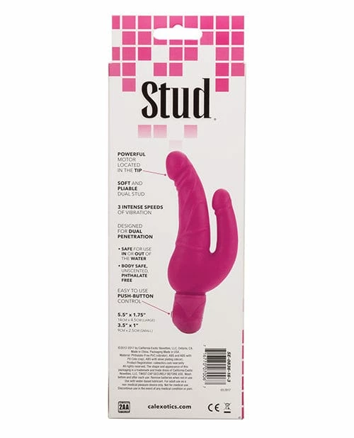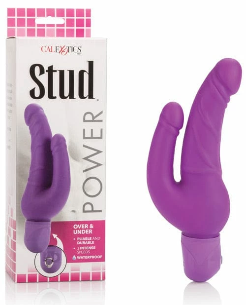 The Waterproof Power Stud Over & Under Dong from CalExotics combines traditional designs with a contemporary flair. Body safe, push-button 3-speed controller, and 100% waterproof. This soft and flexible vibrator offers 3 power packed speeds and push button control. Phthalate-Free PVC (vibrator) ABS/ABS with PU Cote (cap) ABS with Silver Plating (decor). Requires 2 AA batteries. 5.5″ x 1.75″/ 14 cm x 4.5 cm (large shaft). 3.5″ x 1″/ 9 cm x 2.5 cm (small shaft).