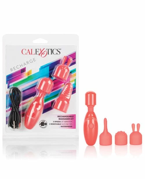 Turn the heat up in the bedroom, in the bath or on your next sensual vacation with the travel-ready Rechargeable Massager Kit. The discreet wand stimulator will thrill wherever you take it with 3 playful vibrations, 3 teasing attachments and a soft flexible neck. Three plush silicone pleasure tips create a truly customizable pleasure experience. Choose between fluttering bunny ears, a flicking tongue-like tickler or a teasing nubbed tip and indulge in your naughtiest fantasies. With the touch of a button, the whisper quiet wand effortlessly increases vibration speed; apply the mini vibe to sensual sweet spots while 3 intense vibration speeds tease and stimulate. Easily control pure pleasure with the single silicone button. Hold the easy-touch button for 3 seconds to turn on/off. The flexible neck and silky silicone attachments lets you deliver intense vibrations from almost any angle. The discreet size makes this massager the perfect travel companion, stash this mini vibe in your purse, pocket or overnight bag to bring orgasmic ecstasy wherever you go. Color: Orange Materials: Silicone / ABS Plastic USB Rechargeable : cable included 50 minute charge time for 2.5 hours of play Measurements 1.75″ x 1″ / 4.5cm x 2.5cm (Bunny Tip) 2.25″ x 1″ / 5.75cm x 2.5cm (Flickering Tip) 1″ x 0.75″ / 2.5cm x 2cm (Head) 1.25″ x 1″ / 3.25cm x 2.5cm (Nubby Tip) 4″ x 1″ / 10.25cm x 2.5cm (Overall) 90 day warranty