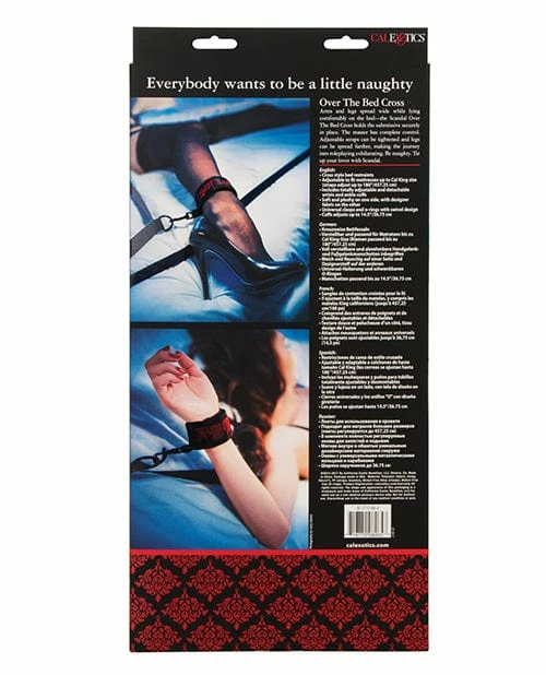 CalExotics Scandal Over the Bed Cross. Cross style bed restraints. Includes totally adjustable and detachable universal wrist and ankle cuffs. Soft and plushy on one side, with designer fabric on the other. Universal clasps and D-rings with swivel design. Polyester (fabric, lining, Velcro) PP (straps, buckles) Acrylic (dowels) Nickel-Free Alloy (clasps) Nickel-Free Iron (D-rings). Adjustable to fit mattresses up to Cal King size (straps adjust up to 180″/457.25cm). Cuffs adjusts up to 14.5″/36.75cm.