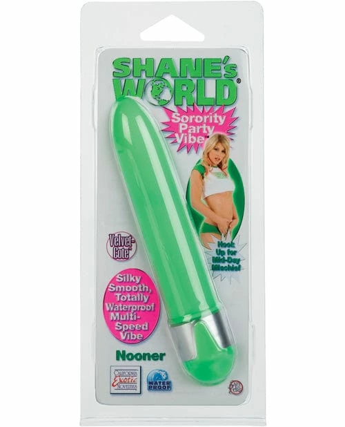 Party on with the Shane’s World Nooner Sorority Party Vibe from California Exotics. The Nooner is a silky smooth, multi-speed massager that is powerful, totally waterproof and lined with Velvet-Cote for your comfort. Hook up for mid-day mischief! Requires 1 AA battery (not included). ABS with Velvet-Cote (PU Cote); Metallic Plating (cap band). 4.75″x 1″/ 12 cm x 3 cm.