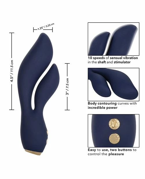 Indulge in personalized pleasure while the curved shaft and teaser shimmies to the rhythm of 10 synchronized vibration speed levels. Control this variety of orgasmic options with the easy-touch control button. The flexible massager is made from a hygienically superior silicone with dazzling gold plated decorative accents.