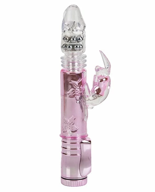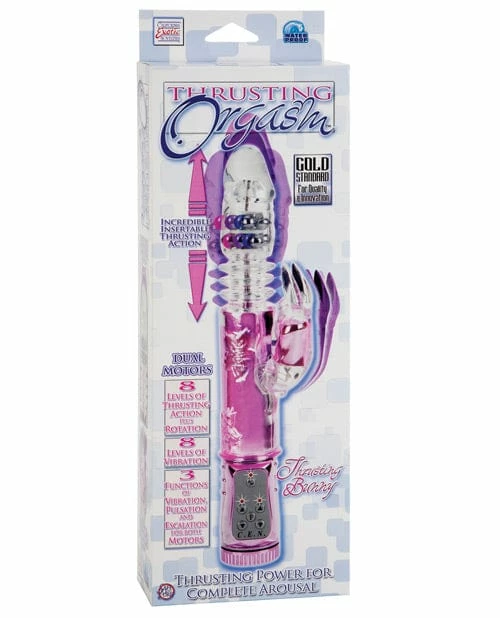 From Cal Exotics comes the Thrusting Orgasm Thrusting Bunny Vibe. The vibe has powerful thrusting action with a vibrating and pulsating bunny. The Thrusting Bunny features dual motors with 8 independent speeds of vibration and 8 independent speeds of thrusting action along with 3 incredible functions of vibration, pulsation, and escalation for both motors. This vibe also features easy push button controls and an auto on/off button. Made of TPR (vibrator) ABS with metallic plating (controller, beads). Requires 3 AA batteries. 5.25″ x 1.5″ (shaft). 2.5″ x 1″ (bunny).