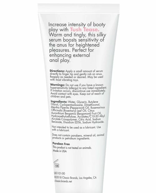 Increase intensity of booty play with Tush Tease. Warm and tingly, this silky serum boosts sensitivity of the anus for heightened pleasures. Perfect for enhancing external anal play. Apply a small amount of serum directly to finger tip and gently rub on anus. Reapply as needed or desired. May be used with most vibrating toys. Warming and tingly serum, ideal for enhancing anal play. Formulated to boost sensitivity and heighten pleasure. Fragrance Free. Ideal for toy, self and couple’s play. This product does not contain parabens or mineral oil. This product is not tested on animals. This product does not contain benzocaine. Made in the USA.