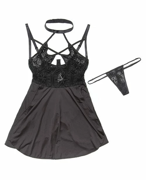 Babydoll and G-string set. Halter neck design. Underwire cutaway cups. Cross-cross strap details. Adjustable G-string included. Flocked Mesh/Microfiber. From Coquette.