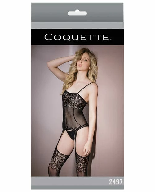 Coquette International Sleek Seamless Stretch Net Cami Top With Lace Print Detail & Attached. Stockings