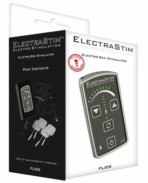 A revolution in electro stimulation technology the ElectraStim Flick Stimulator Pack not only has seven built-in programs including escalating patterns but is also able to stimulate in rhythm with “Flicking” movements of the control unit! Whether you simply want to add your own stimulation “beat” or want to stimulate in direct sympathy with your own wrist movements during masturbation, this patent pending feature will be like nothing you have tried before! The Flick feature can be slow or fast, soft or hard – it will mimic the sensation that suites your, or your partners, desire. The new generation ElectraStim Flick is also the first product of its kind to incorporate a USB re-chargeable system allowing the Flick unit to be operated up to 4 hours between charges. Pack contains: ElectraStim “Flick” output stimulator, 4 x square self-adhesive electrode pads, stimulator output cable, USB charging cable (charge not included), protective pouch, and instructions.
