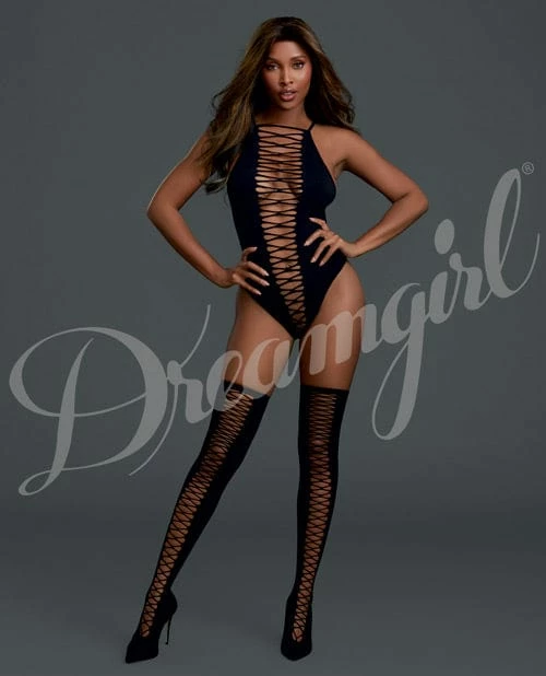 Dreamgirl International Cross Open Front Teddy With Matching Thigh Highs Black One Size Fits Most Lingerie