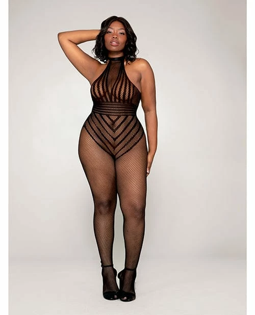 Dreamgirl International Halter Neck Open Crotch Fishnet Bodystocking W-striped Teddy Design Black Qn Lingerie