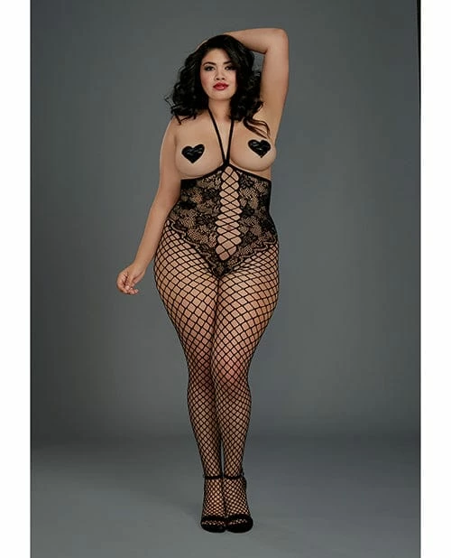 Open-cup bodystocking with knitted-lace teddy design, fishnet legs, open crotch and adjustable halter ties. G string sold separately. (Pasties not included.)