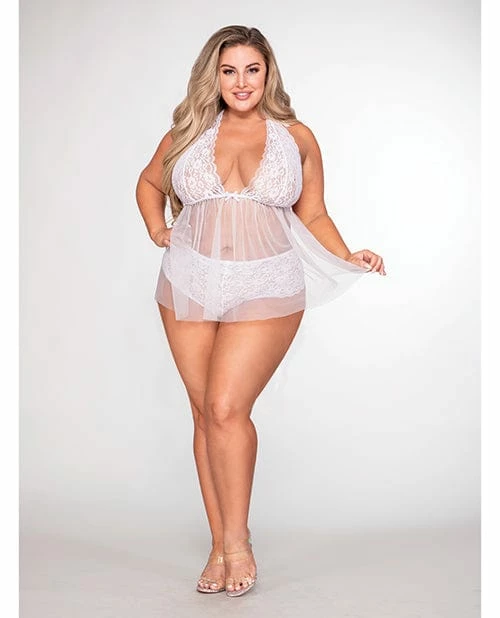 Dreamgirl International Lingerie Retro Short Stretch Lace & Mesh Halter Babydoll & Panty White Qn