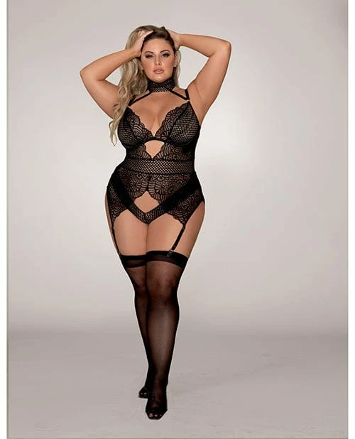 Dreamgirl International Scalloped Stretch Lace, Snap Crotch Gartered Teddy Black