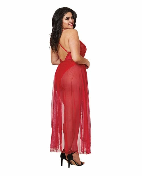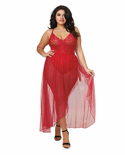 Dreamgirl International Stretch Lace Teddy (modified Back) & Sheer Mesh Maxi Skirt With Adjustable Straps & G-string Rouge