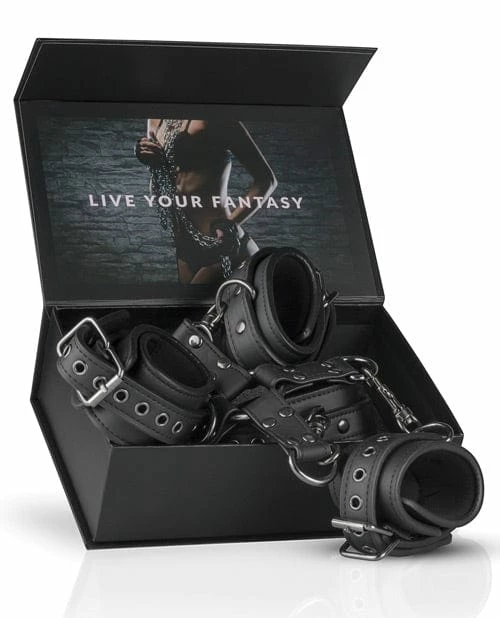 Complete your bondage game with this fun set! The set consists of handcuffs, ankle cuffs and a hogtie that can be used anyway you want. The cuffs are attached to the hogtie with clip fasteners, so you can easily detach them and use them separately or attach them to other bondage toys, such as harnesses or collars. The cuffs and hogtie are made of sturdy faux leather and metal and very durable. The cuffs are adjustable for a perfect fit and lined with foam for a comfortable use.