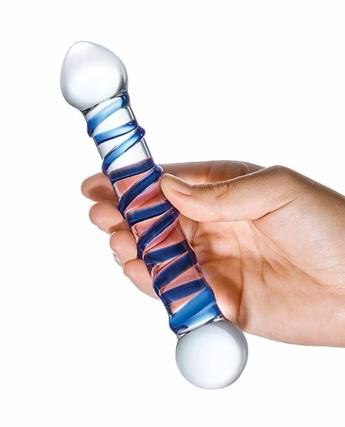 Take your quest for pleasure to dizzying new heights with the glass Spiral Dildo. This handmade, elegantly constructed adult toy is clear with raised, blue spirals along its shaft to add a unique sensation of excitement. The Spiral Dildo is 6.5 inches in length and made from carefully designed, durable, and body-safe borosilicate glass. It is ergonomically designed for easy, pleasurable insertion with an enlarged head for ultimate satisfaction. The glass Spiral dildo is built for easy upkeep, can pair with every available lubricant, and is cleaned for re-use with soap and water. This lengthy, tasteful dildo retains a range of temperatures for adaptable bedroom play. Run it under a warm tap to heat things up or place it in your freezer for a chillier encounter. Add a new gem to your collection and upgrade your sex life with glass.