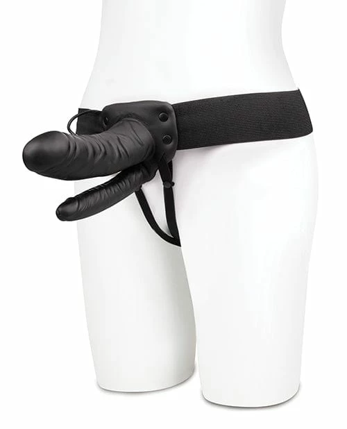 Step up your sex game with the Lux Fetish Unisex Vibrating Hollow Double Penetration Strap-On Dildo. This adult toy provides double penetration for twice the pleasure with a hollow dong and anal dildo built for accessible anal entry and stimulation. Feed your curiosity for intense, pulsating pleasure with seven multi-speed vibration levels. There is an adjustable stretch elastic waistband for maximum comfort. Great for users of every identity with a harness that fits most. Material: PVC, ABS and Nylon Color: Black Requires 2 AAA batteries. (not included)