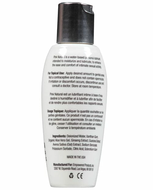 PINK Natural is our new water-based lubricant designed for women and couples looking for very high-quality body-conscious formulations. PINK Natural combines de-ionized water and Organic Aloe Vera Gel, fortified with extracts of Ginseng, Guarana and Avena Sativa (Oat). We minimized or removed most other ingredients from our very popular PINK Water formula to create PINK Natural. 4.7 oz. Ingredient: DI-Water, Xanthan Gum, Organic Aloe Vera Gel, Ginseng Extract, Guarana Extract, Avena Sativa Extract, Sodium Benzoate, Potassium Sorbate, Citric Acid, Sclerotium Gum.