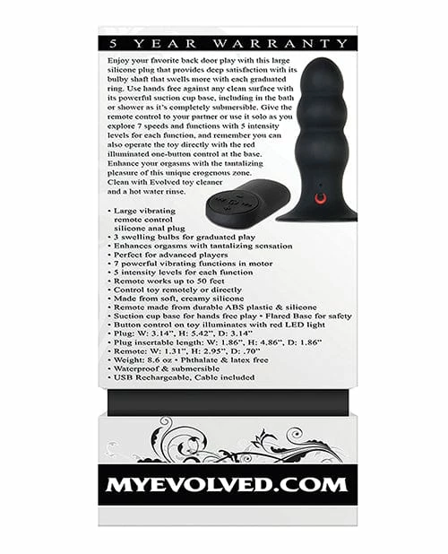 Enjoy your favorite back door play with this huge silicone plug that provides deep satisfaction with its bulbous shaft that swells more with each graduated ring. Use hands free against any clean surface with its powerful suction cup base. Completely waterproof and submersible for shower/bath play. Give the remote to your partner or use it solo to explore 7 speeds and functions with 5 intensity levels for each function. Remote range up to 50 feet. You can also operate using the controls on toy itself.