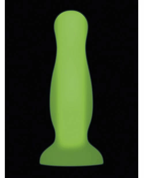 Glow in the dark while you experience a mind-blowing orgasm! The large butt plug glows a groovy green at its inner core, with a dual layered silicone shaft that feels squishy and soft and flexes with your body. Advanced anal players will love the size and the bowling pin shape that tantalizes upon entry and then keeps giving until you say stop!. Flared base for safety and a powerful suction cup for hands-free play.