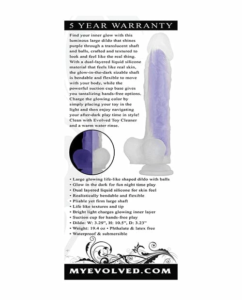 This large luminous dildo has a unique glowing inner core that charges in the light for extra fun and pleasure in the dark! Its life-like large shaft is crafted with dual layered body-safe liquid silicone for a real skin feel. The powerful suction cup is perfect for sturdy hands-free play, and the bendable, flexible body shaft moves with you as you take it all in! Five Year Warranty.