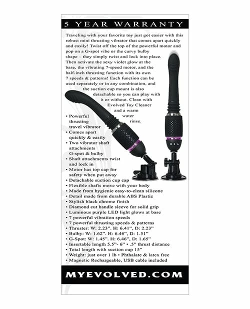 Traveling with your favorite toy just got easier with this robust mini thrusting vibrator that comes apart quickly and easily! Twist off the top of the powerful motor and pop on a G-spot vibe or the curvy bulbous shape – they simply twist and lock into place. Then activate the sexy violet glow at the base, the vibrating 7-speed motor, and the half-inch thrusting function with its own 7 speeds & patterns! Each function can be used separately or in any combination, and the suction cup mount is also detachable so you can play with it or without.