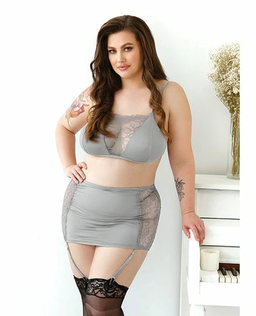 Curve Layne Lace & Microfiber Bralette with Garter Skirt & G-string Gray XL/2x