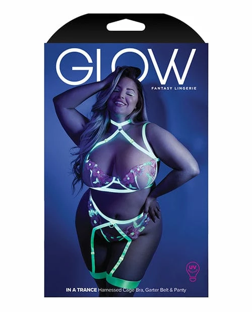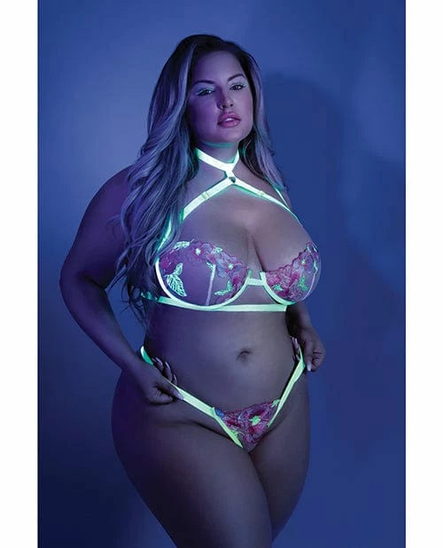 Fantasy Lingerie Glow Black Light Embroidered Harness Bra, Leg Garterbelt & G-string Neon Chartreuse Qn