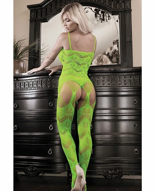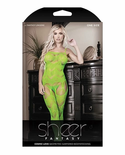 Fantasy Lingerie Sheer Cosmic Love Strappy Geometric Gartered Bodystocking Neon Green One Size Fits Most