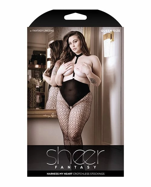 Fantasy Lingerie Sheer Fantasy Choker Harness Stockings W-open Crotchless Black Qn