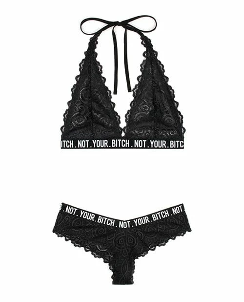 Lace Halter Bralette with “Not Your Bitch” Elastic Strap and Matching Cheeky Panty. Thick adjustable straps. Halter tie. Stretch lace fabric. Matching Panty Fabric Content: 90% Polyamide 10% Spandex Washing Instructions: Hand wash separately in cold water.