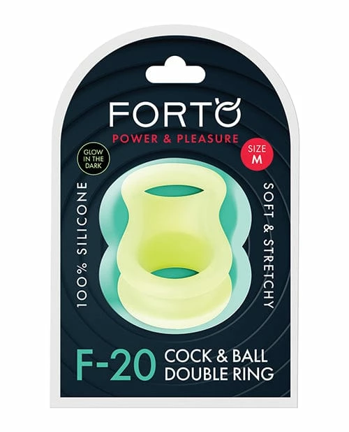 Forto Power & Pleasure. Explore New Thrills. F-20 Glow in the Dark 100% Liquid Silicone Cock and Ball Double Ring. Soft and Stretchy. Stretches up to 2x its size.