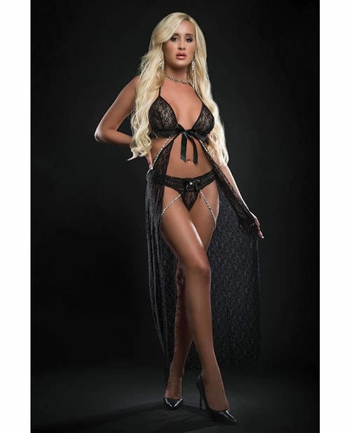 Edgy elegant lace makes a sexy statement on a cut out flyaway long gown with open front ribbon and embellished pearl chain and crisscross details. Matching panty.