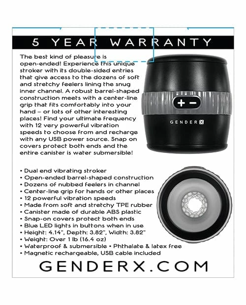 The best kind of pleasure is open-ended! Experience this unique stroker with its double-sided entries that give access to the dozens of soft and stretchy feelers lining the snug inner channel. A robust barrel-shaped construction meets with a center-line grip that fits comfortably into your hand – or lots of other interesting places! Find your ultimate frequency with 12 very powerful vibration speeds to choose from and recharge with any USB power source. Snap on covers protect both ends and the entire canister is water submersible!