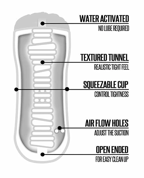 Just Add Water. Shower Stroker. A few drops will do! Reusable strokers get slippery without lube. Extra Stretchy to fit most. Reusable and substantial stroker. Soft, tight and lifelike masturbator. Use sleeve independently or in cup. Waterproof hang cord for shower. Easy to clean.